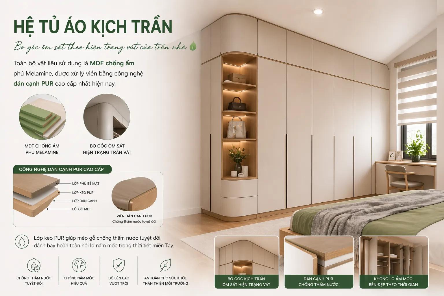 Chiếc tủ áo mua sẵn đóng vai trò như một "bức tường" cản gió đã bị loại bỏ. Thay vào đó là hệ tủ áo thiết kế kịch trần, bo góc ôm sát theo hiện trạng vát của trần nhà. Toàn bộ vật liệu sử dụng là MDF chống ẩm phủ Melamine, được xử lý viền bằng công nghệ dán cạnh PUR cao cấp nhất hiện nay. Lớp keo PUR giúp mép gỗ chống thấm nước tuyệt đối, đánh bay hoàn toàn nỗi lo nấm mốc trong thời tiết miền Tây.