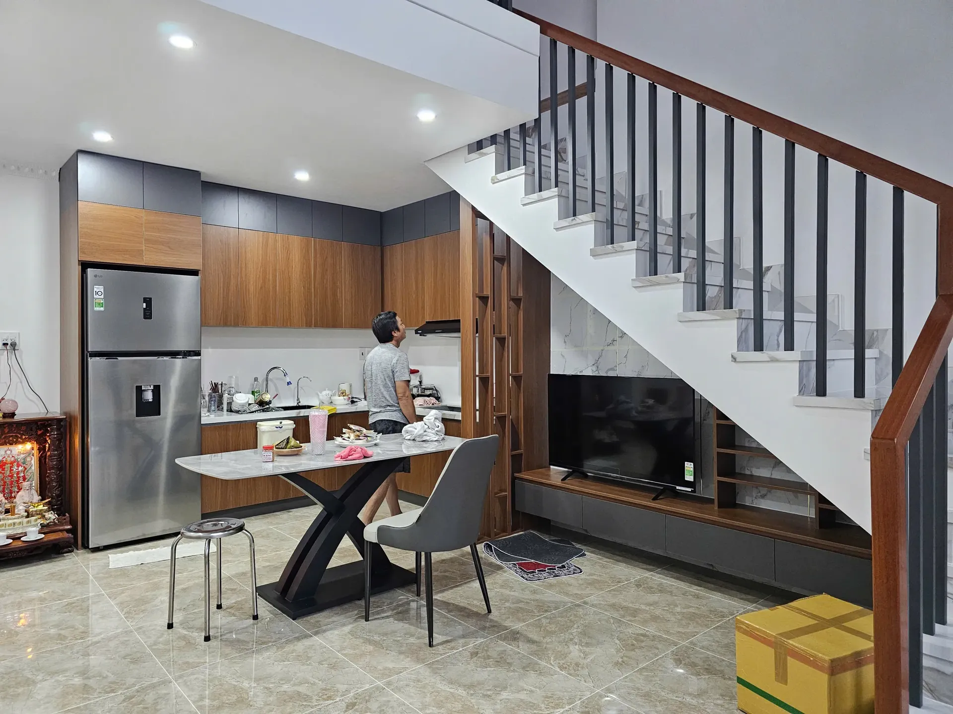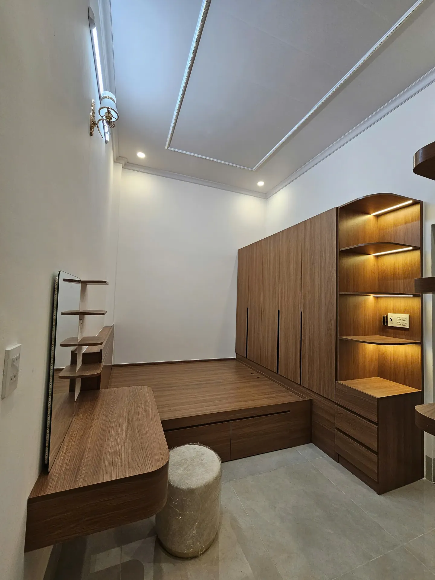 Nhiều căn nhà phố có diện tích hẹp ngang hoặc nhiều góc xéo. Thay vì sử dụng nội thất đóng sẵn kém linh hoạt, đội ngũ kỹ thuật của chúng tôi tiến hành đo đạc laser tại công trình. Hệ thống máy cắt CNC hiện đại sau đó sẽ gia công phôi gỗ chính xác đến từng milimet, giúp tủ bếp, tủ gầm cầu thang hay tủ áo kịch trần ôm sát vào mọi góc cạnh của ngôi nhà, triệt tiêu hoàn toàn "góc chết".