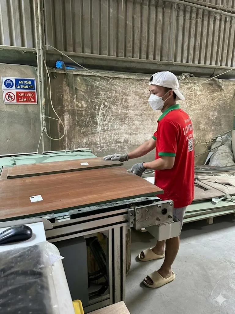 Bạn có thể dễ dàng nhận ra sự khác biệt của Lợi Phát qua những đường viền cạnh tủ. Thay vì dán cạnh thủ công dễ bong tróc và thấm nước, chúng tôi ứng dụng công nghệ dán cạnh PUR tiên tiến. Mép gỗ không đường line, nhẵn mịn, kháng nước tuyệt đối – cực kỳ phù hợp với môi trường khí hậu nóng ẩm đặc trưng của miền Tây.